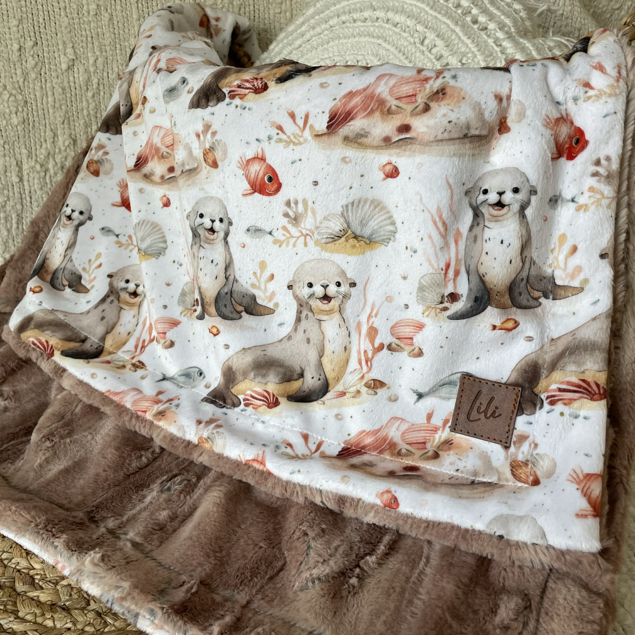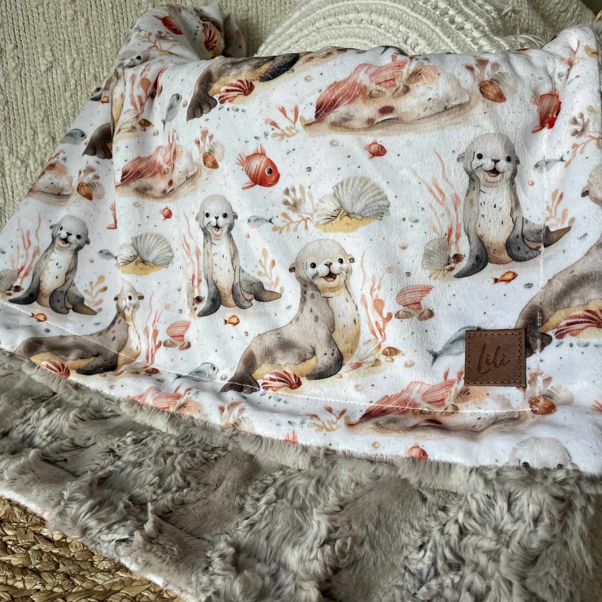 Un côté motif en minky imprimé au Québec ou en Amérique du Nord (pour certains motifs)